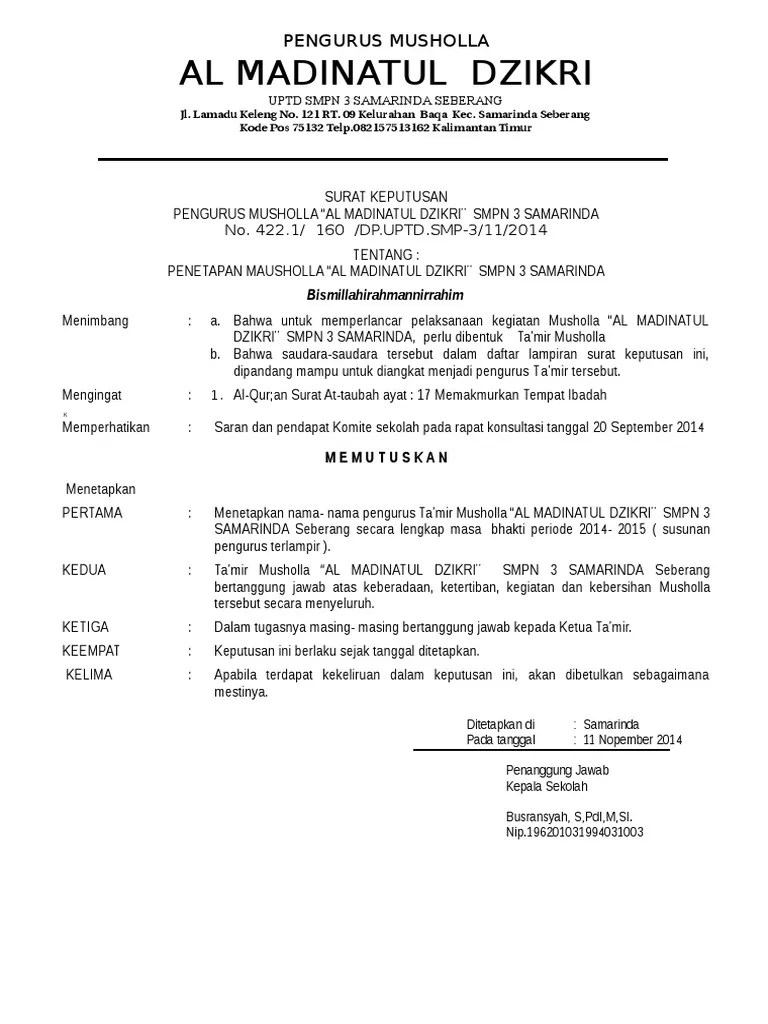 Bahwa untuk mencapai maksud tersebut di atas maka dipandang perlu surat keputusan tentang susunan pengurus masjid;. Contoh sk tokoh agama terbaru sk kepala desa tentang takmir masjid sk pengurus masjid . Susunan pengurus masjid raudhatul jannah kompleks griya mulya asri gma kelurahan pai . Contoh sk pengurus masjid 2019 doc guru ilmu sosial. Bahwa masa bakti kepengurusan takmir masjid al falah periode tahun 2008 2013 telah berakhir pada tanggal 21 desember 2013 b.